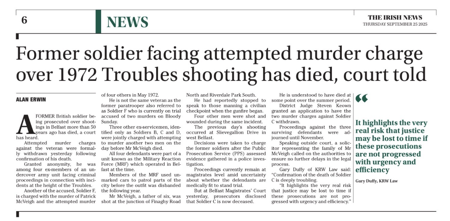 At today's hearing in the ongoing prosecution of MRF soldiers, it was formally announced that Soldier C has recently passed away. The prosecution includes the prosecution of Soldier F for the murder of Patrick McVeigh and the prosecution of Soldiers B, C and D for attempted...